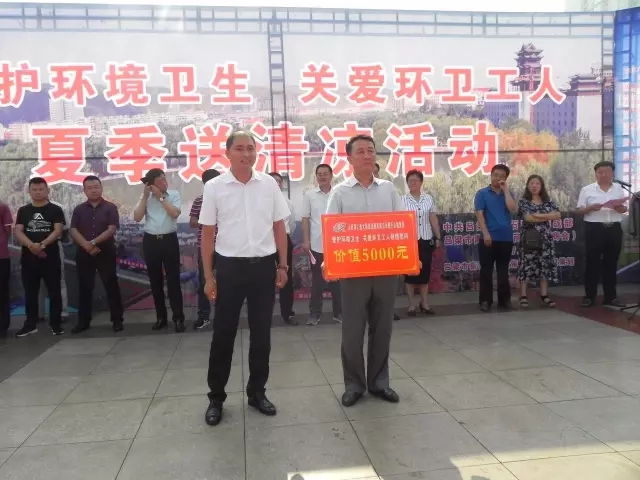 圖為:山西同仁康副總經(jīng)理向環(huán)衛(wèi)工人送上慰問品